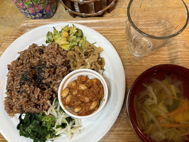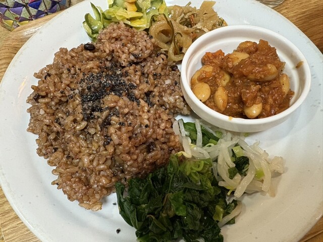 プレートには酵素玄米、チリビーン、切り干し大根の煮物、キュウリとキャベツの浅漬け、自然栽培のほうれん草のお浸しが並ぶ。スープは野菜の出汁と塩胡椒のみ。完璧なビーガンメニューだ。