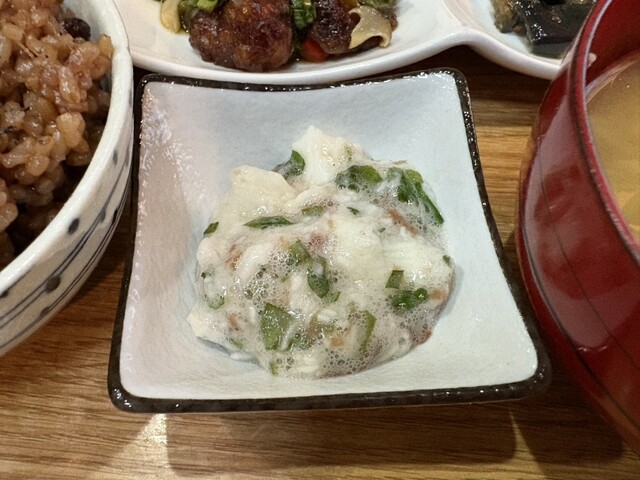 酵素玄米に、茹でじゃがいものおろしにんじん和え、大豆ミートと野菜の中華風、ニラのナムル、カブのお味噌汁。絶品だったのは、揚げナスの甘味噌和え!