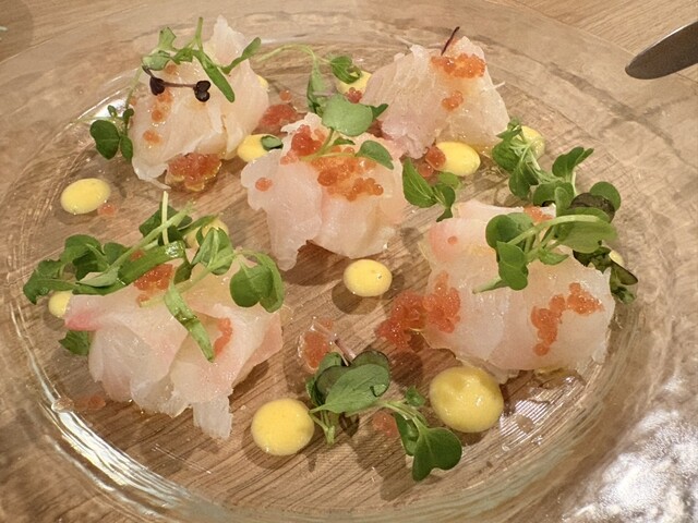 続いて目を見張ったのがガラスの皿に咲いたカルパッチョの花。なんでも生姜を食べて育った真鯛とのことだが、養殖魚の脂っこさや臭みとはまるで無縁だった。みかんのソースが生魚の新しい食べ方を教えてくれた。