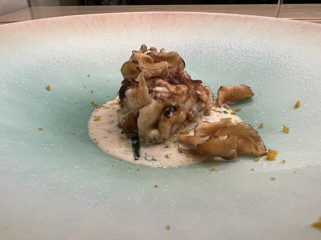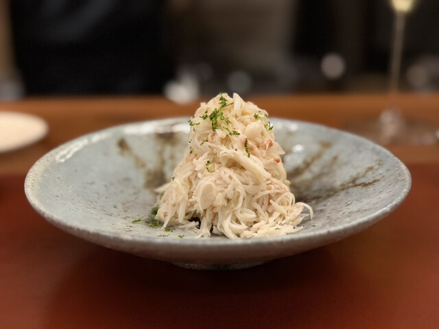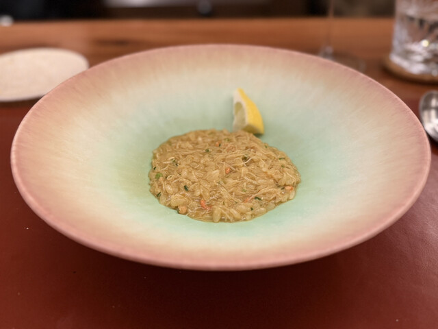1時間炊いて取った出汁に松葉蟹、渡り蟹、香住ガニのエキスまで使って、実に濃厚な味わいながら、途中にレモンを絞るとサッパリしてパエリアのようなイメージをして作ったリゾットとの事。濃厚かつコクがありながら、後味と余韻まで素晴らしい。