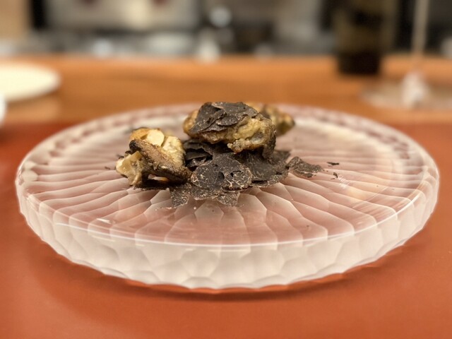 全国的に牡蠣がダメな現状でも冷たくキレイな水で育って、毎週検査した生食でも大丈夫な安全な牡蠣を薪焼きで加熱して火を入れてる。黒トリュフを使った冷たいカルボナーラソースで。バッグボーンの違う食材を高い次元で完全に一体化させる木下イタリアンの凄さをここでも知る。