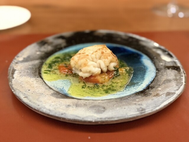 ゲストの入店直前に階下の水槽から上げてきて、生きたまま捌いて薪焼きにして仕上げた物。数種類のフルーツトマトのソースたっぷりで。これまたメリハリある良き出来色で印象に残ります。