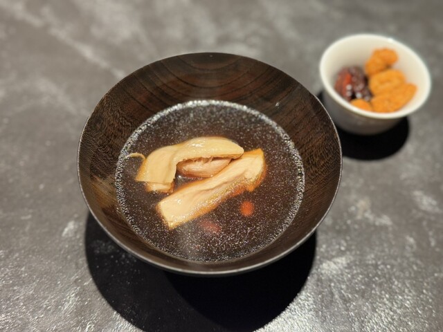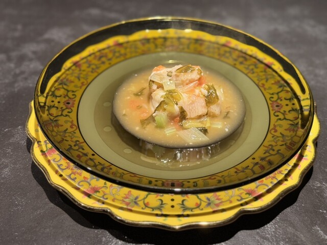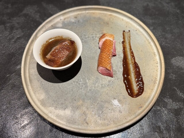 ◉七谷鴨(京都)の炭焼きとモモ肉とガラを炊いた物。シュジョンという味噌と塩で。