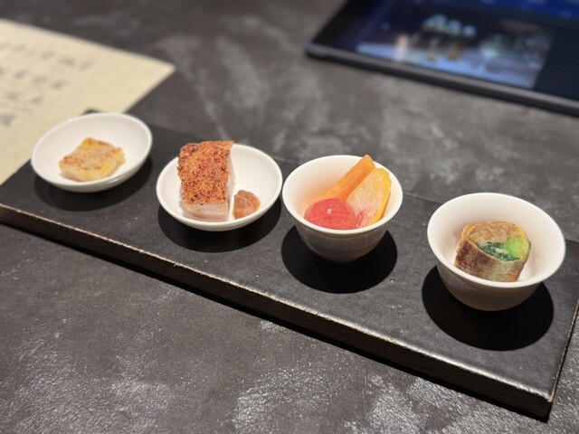 ◉4種の前菜。左から銀杏の大根餅。クリスピーポーク(皮付き豚)。甘酢漬け。湯葉巻き