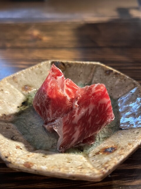 提供は、店主自らの目利きにより全国から仕入れられた希少な長期肥育の銘柄牛などの刺しや一品、焼物などからなるお任せコースのみ。