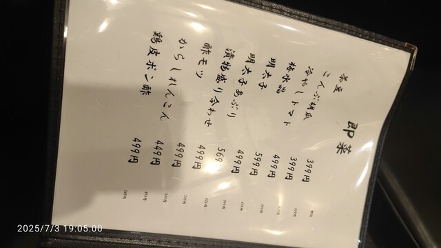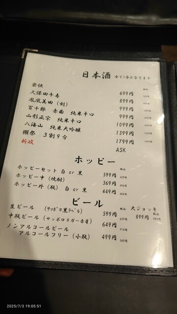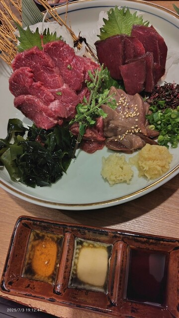 馬刺し盛り合わせは一切れ大きく食べごたえがあり、あっさりとした味わいで美味しかった。特に九州の甘い醤油で食べるのが好みであった。