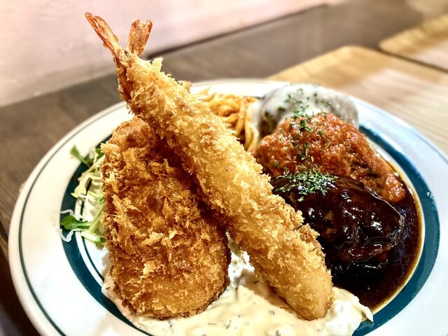 ・ハンバーグプレート(カニクリームコロッケ&エビフライ、目玉焼き みそ汁付き)