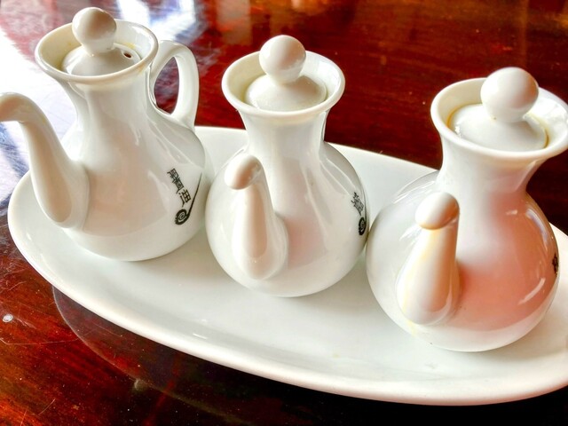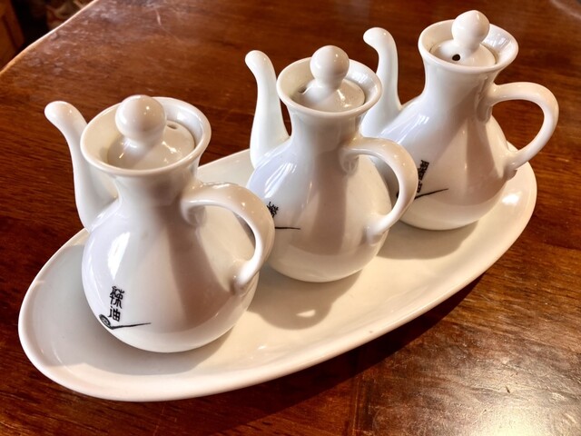餃子と共に運ばれます。辣油。醤油。酢。この清潔さ、好ましいです。