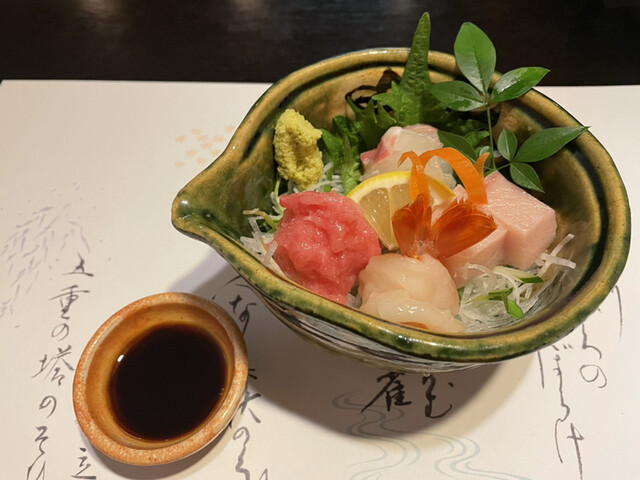 梅おろし山芋ソースの豆腐、刺身、鱧唐揚げ、タコの炙り焼き、切り干し大根のサラダ、海老天2尾、茶碗蒸し、霜降り黒毛和牛の薄焼き、メバルの煮付け、湯葉餡、鱧の柳川鍋、ご飯とお吸い物、抹茶のアイス