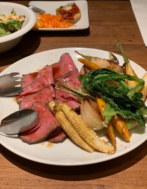 外は猛暑中の猛暑。生ビールで乾杯をして喉をうるおし、前菜、サラダ、野菜のフリット、4人全員がうなるほど柔らかいローストビーフ、最後にハンバーグとステーキのコンボ、そしてデザート。