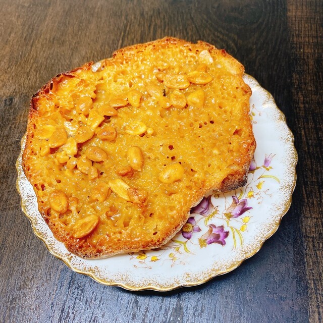 ピーナッツフランス(290円)…甘くてガリガリフロランタンのような食感のピーナツバタークリームはナッツの香ばしい香りがガツンとくるもので、下のフランスパンの心地いい塩味のついた小麦味といい感じに調和している。さらにクリームの下層にはドーナツのようなサクサクの揚げ油風味が漂う、じゅわぁと油が染み出してくれる生地層があり全体をオールドファッションに近い美味しさに仕立ててくれている。薄いながらもザクザク食感やナッツの香ばし風味、バターのような油の染み出しが感じられる満足度の高いアメリカンなパンだった。