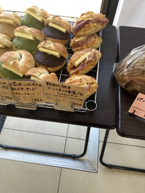 粉対比100%コーンと生ハム有塩バターリュスティックサンド(540円)…リュスティック生地は超加水のもちゅもちゅしっとりなフランスパンって感じ!たっぷりコーンが入っていて、生地の美味しい小麦と自然な甘さ同士がコラボして優しい美味しさ。生ハムが肉肉しい旨味を醸し出してくれるし、何よりバターがたっぷりで濃厚クリーミーな塩味も合わさってバターが載ったステーキを食べているような幸せ感!!優しい甘さの食パンをステーキと一緒にバターたっぷりでいただくような美味しさでした!