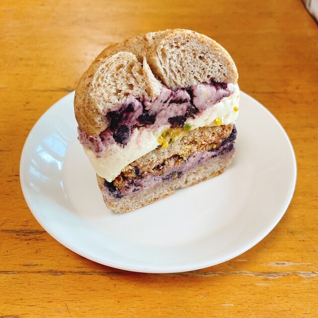 ブルーベリーレアチーズタルトベーグルサンド(680円)…プルンプルンでヨーグルトのような酸味もあるとろけるようなレアチーズケーキ、ブルーベリーの酸味の効いた乳酸菌味が美味しいクリチ、ガリガリ塩バターチャンククッキーとベーグル両方の全粒粉生地で、とろける本格レアチーズと全粒粉の美味しさコラボがマッチしたベーグルでした!