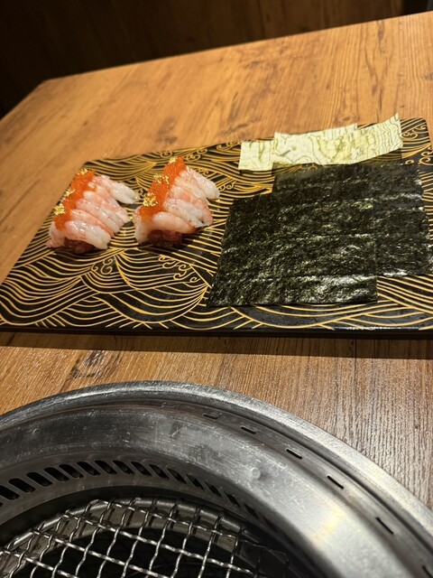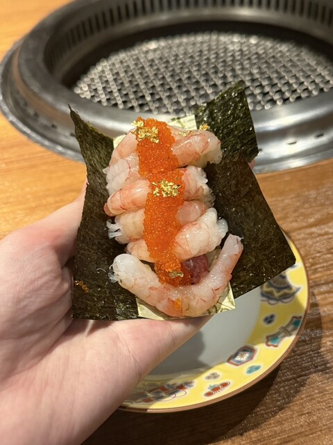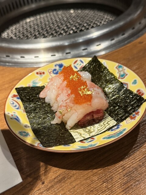 海苔の上に昆布シートをつけ、兵庫県産のウチもも肉と一緒に甘エビを乗せていただきます。甘エビのプリっとした食感が美味しいです。