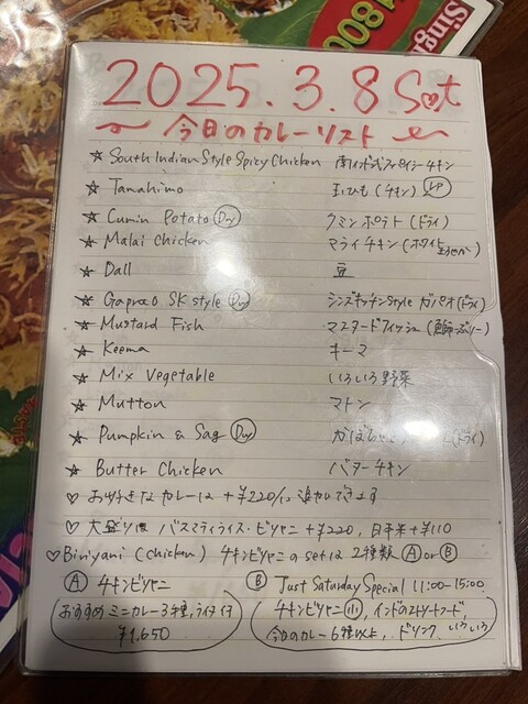 最初一口目は塩っけがキツいかな?と思ったけど、食べてたらそこまでそうでもなく、ルーの中にマスタードの粒が入ってて、珍しいカレーを頂けました。