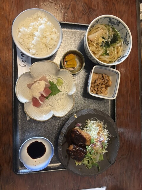 このご時世、刺身・味噌カツ・小鉢・うどん・ご飯で