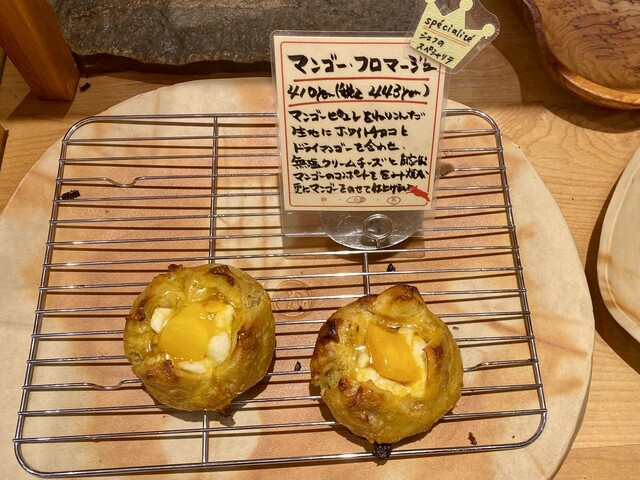 マンゴーピュレを練りこんだ生地にホワイトチョコとドライマンゴーを合わせ、無塩クリームチーズと自家製マンゴーコンポートを包んで焼き上げ、最後にマンゴーを乗せたパン♪