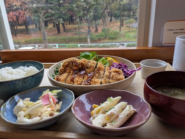 ランチで行きました。この日は10時から開店のため10時40分くらいに行きましたが待機はゼロでした。見せ前に階段があります。カウンターで前払いで注文しできたら取りに行くスタイルでした。10種類位定食メニューがありました。豚カツ定食にしました。できたてサクサクで美味しかったです。このボリュームで1100円でした。コーヒー、お茶、水飲み放題で公園を眺めながらのんびりできました。コスパ最強のお店だと思います。また利用させていただきます。