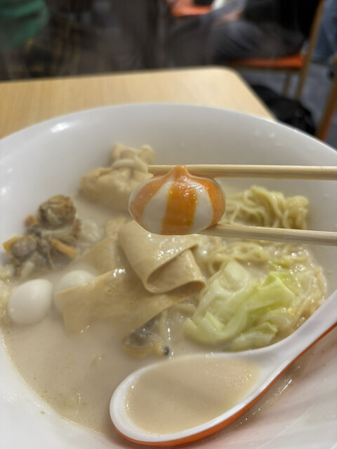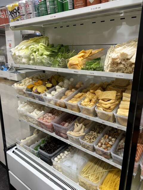 ホタテ、アサリ、餅巾着、油揚げ、たまご麺、彩虹巻、湯葉、キャベツ、えりんぎ、うずらにした