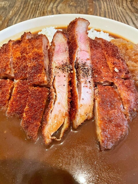 メインのカツカレーは茶美豚を使用したサクサクで美味しい。