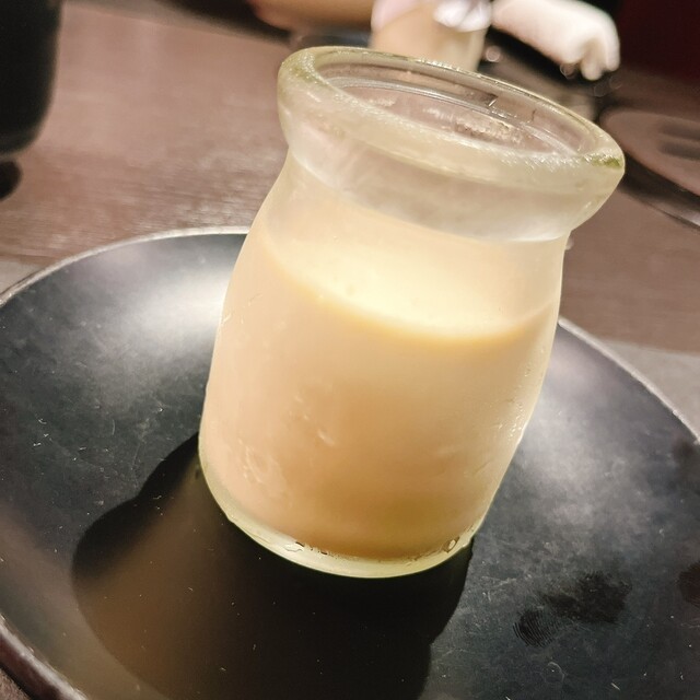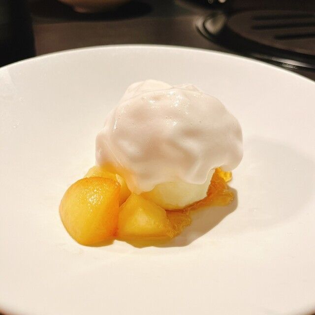 練乳っぽい味のアイスの上にエスプーマ風。和三盆のジュレに桃の果実がたまらん…!