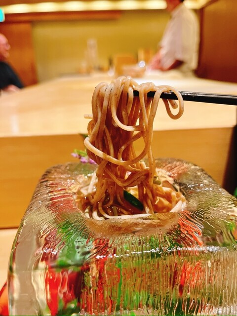 ドカンとした氷の器にお蕎麦、そしてじゅんさいとすだちが浮かぶ涼やかな一品。