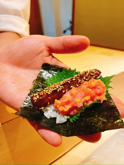 和牛、ウナギ、肉、海苔、ネギが降りかかったインパクトある〆!