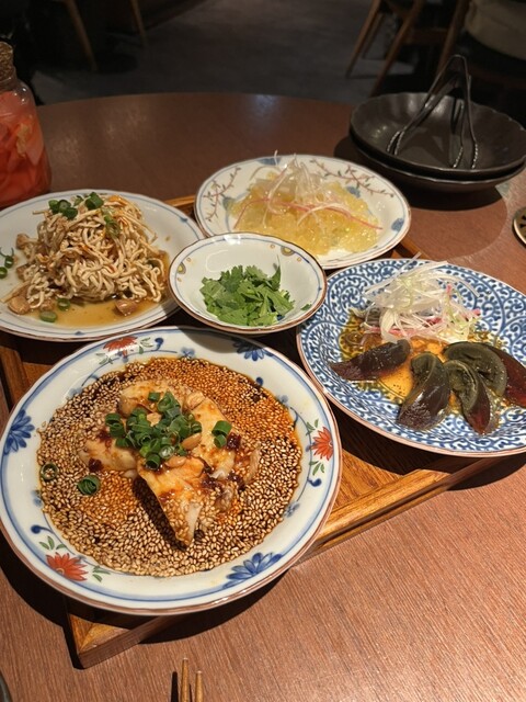 前菜盛り合わせは、よだれどり、ピータン、クラゲの塩檸檬漬け、細切り豆腐とパクチーの辣油和えと、味の方向性が異なる品をバランス良く楽しめる構成。