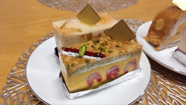 ライチとピスターシュヌガーが入ったハチミツのバタームースとフランボワーズのジュレで構成されています。フランボワーズのジュレの層が厚く、ライチもたっぷり入っていて、また生地の部分が少ないこともあり、果実感が強かったです。華やかな味わいのお菓子でした。