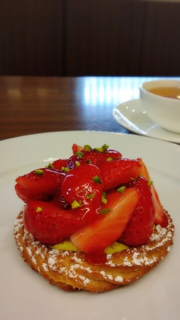 イートイン限定のプチガトーです。運ばれてくるといちごがふわっと香ります。土台は中央がメレンゲ、その周りはマジパンをベースにした生地を絞ったものです。その上にピスターシュのムースリーヌに赤い果実がたっぷりと乗せられています。