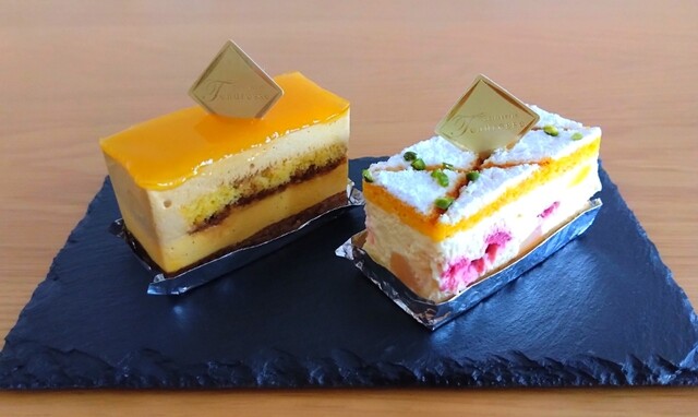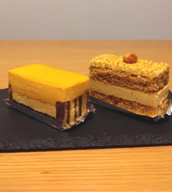 エキゾチックフルーツ(マンゴー、パッションフルーツ、バナナ)のジュレがオレンジのムースに包まれた上段、そしてオレンジの果実がミルクチョコレートのクリームに覆われ、それがさらにフランス ディジョン地方の銘菓であるパン・デピスで包まれた下段で構成されるケーキです。オレンジのムースは酸味の少ない甘いムース(少し意外でした)。ジュレはブリン!と弾力があるタイプで、ムースとの食感の違いが際立ちます。パン・デピスのスパイスと南国のフルーツ、チョコレートが不思議なハーモニーを奏でる上等なお菓子でした。