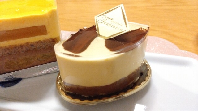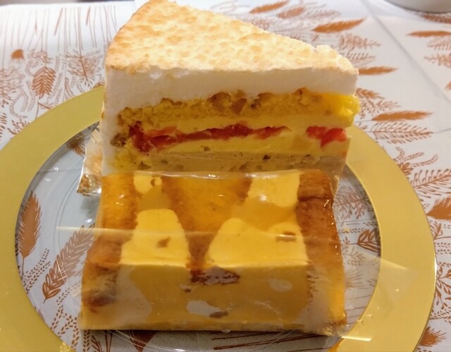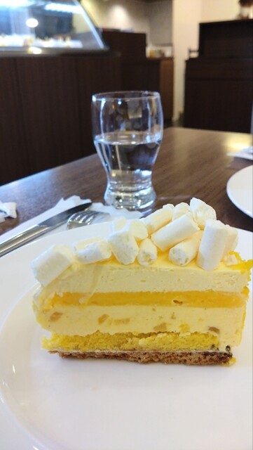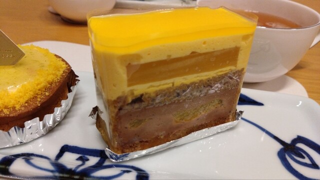 パッションフルーツとコーヒーの組み合わせのプチガトーです。パッションのジュレ、コーヒー風味のババロア、パッションのスポンジ、甘く苦いコーヒーのスポンジ、パッションのババロア、さっくりとしたスポンジ、と6層になっています。意外な組み合わせですが調和がとれており、なかなかおしゃれなケーキです。