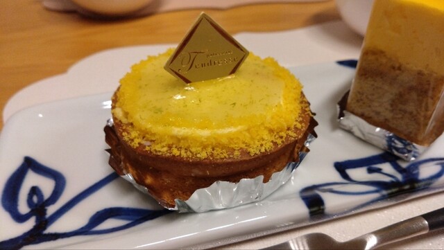 3種類のレモンクリームとレモンのパン・ド・ジェーヌ、レモンのコンフィ、レモンのメレンゲと、6つのレモンのパーツとサブレから構成されたお菓子です。レモンコンフィのほろ苦さがアクセントになっていました。底のサブレ以外は全てレモン風味なのに食感でしっかりコントラストがついているという、いかにもタンドレスらしいお菓子です。上のメレンゲは、持ち帰りでは別添えになるようでした(今回はイートインしたので、乗った状態で運ばれてきました)。