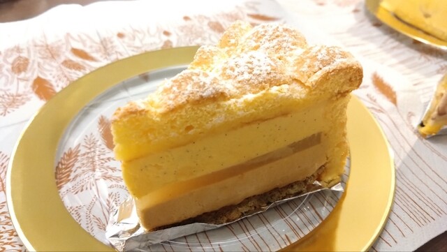 ソーテルヌ(極甘口の貴腐ワイン)をたっぷり使用したムースに白桃、パイナップル、キイチゴが入っています。ムースのなめらかさ・やわらかさと、ダコワーズ生地との食感のコントラストが素晴らしいです。ムースはほとんど砂糖が加えられていないのか、ワインの自然な甘みと風味が楽しめます。値段は張りますが、大人のための極上のケーキです。サクサクの湿気を避ける&ムースの崩れを避けるために、本当はこれもイートインがよいのだろうと思います。