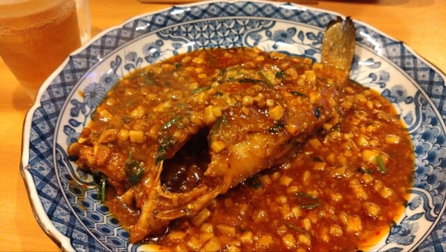 丸々一匹の豪華な一品でした。ふっくらしっとりの身に、細かく刻んだ豚肉がたっぷり入った生姜香るしっかり辣なソースがかかっていました。