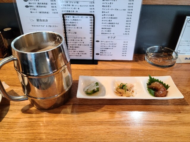 ビールを注文。続いて、皮(タレ)、ズリ(塩)