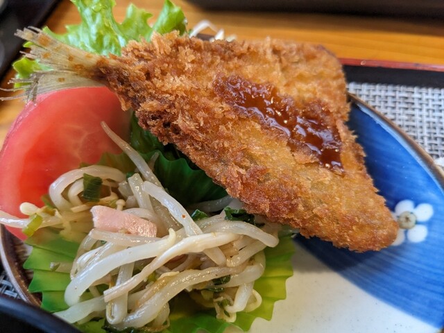 アジフライ、モヤシとハムのナムル、サラダ、奥にはマヨがタップリ盛られてます(≧▽≦)