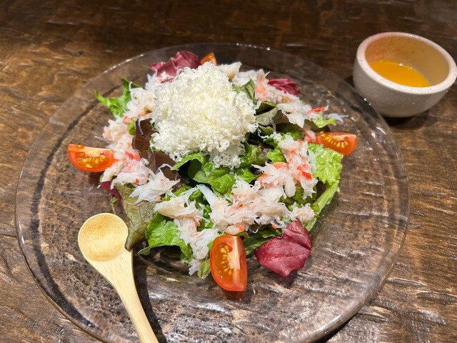 真っ先に驚いたのがサラダ!カニカマじゃないカニサラダ初めてで(泣