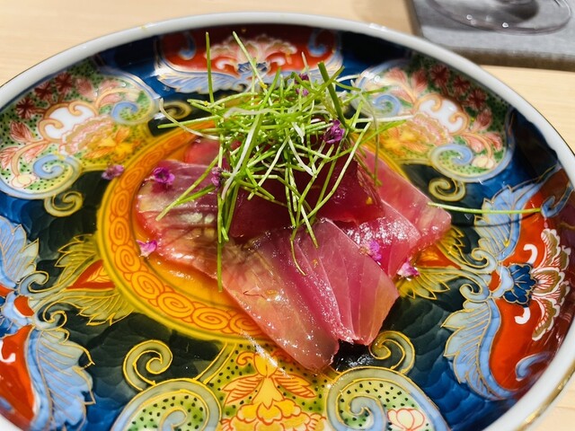 鮪で有名なやま幸さんからのお花もあり、期待を持って入場、室内もモダンでかっこよく、漆芸品などの美術品が多数あって大人の隠れ家には最高な空間、なかなかお目にかかれない樹齢300年以上の木曽檜一枚板のカウンターに圧倒されながら着座。