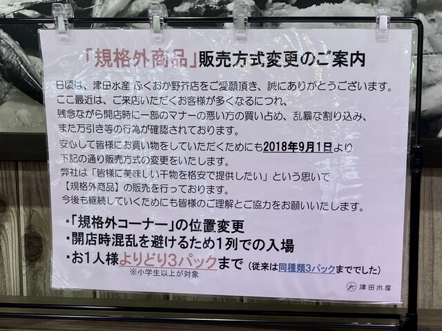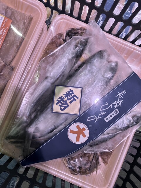 ・朝10時オープンと同時に「規格外商品」の販売あり、当日販売個数限定。1パック324円。ひとり3パックまで購入可能。この日は「ワイン仕込みさばみりん」「長崎県産あじ黒みりん」など数種類あり。