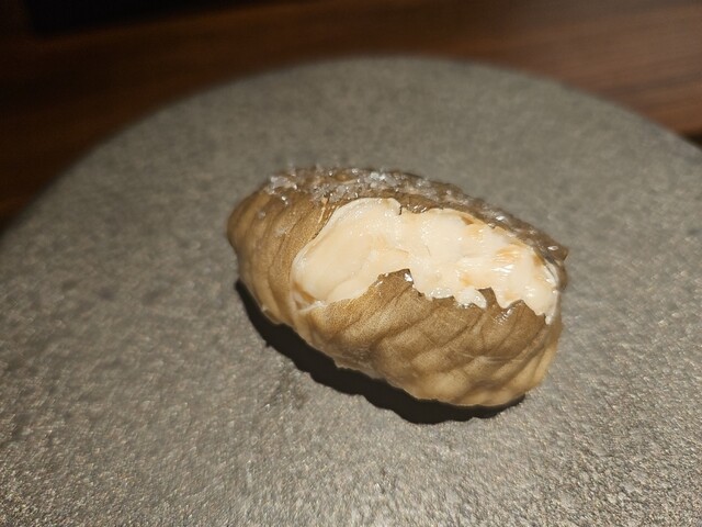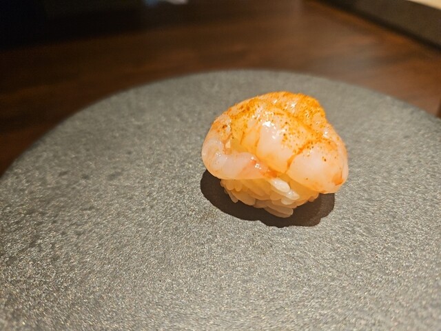 塩〆の後に風にあてて1夜干しにしているようです。海老殻の粉がふりかけてあってねっとりした海老の味と殻の香ばしさが絶妙です。