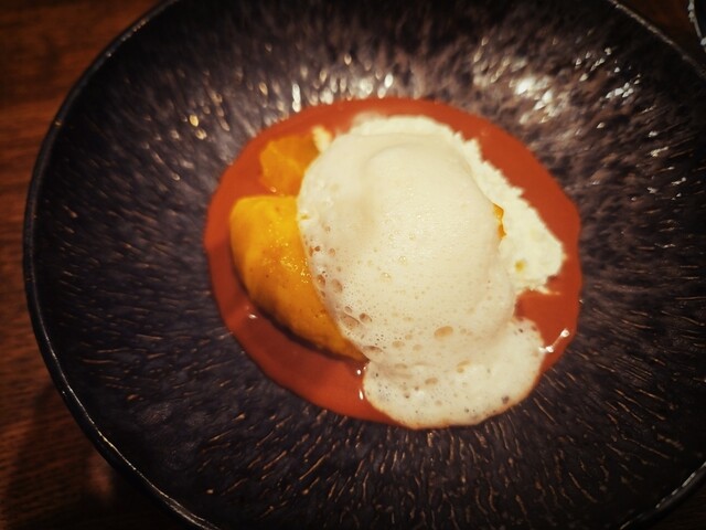 目の前で丁寧に作っている様子を見ながらいただくのは勉強になりました。シェフの地元の食材を使った「蕪のアイス」は是非食べて欲しい逸品のようです。