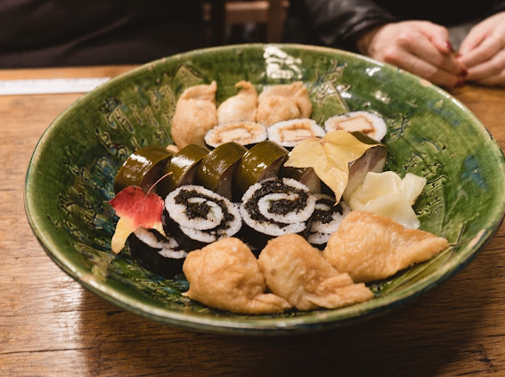 上からお稲荷さん、お麩巻き、鯖鮨、海藻巻き、お稲荷さん。