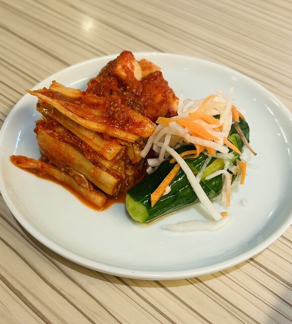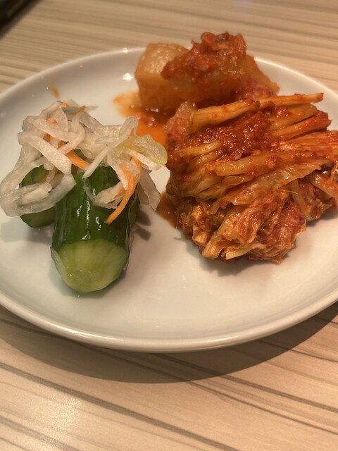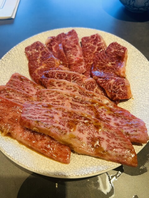 上カルビ、上ハラミ、リブロース、友さんかく、と、キムチ盛り合わせ、ネギだれ、テールスープをいただきました。