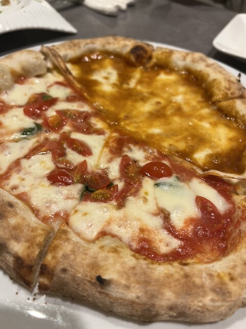 初めて夜行きました♪3人で予約した時はカウンターだったけど個室に変更してもらえました。おしゃれな空間でコースを注文!好きなピザをハーフハーフに出来たので四種、パスタを注文しました。めちゃお腹いっぱいでお皿に残していたらお持ち帰り用に包んでくれました✨どのピザもめちゃくちゃ美味しい〜!!