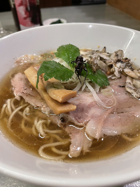 Ramen noodles made from cricket soup stock. It seems to be treated as an immoral thing, but it is seriously delicious. I feel infinite possibilities. It is a wonderful ramen that is both interesting and tasty.