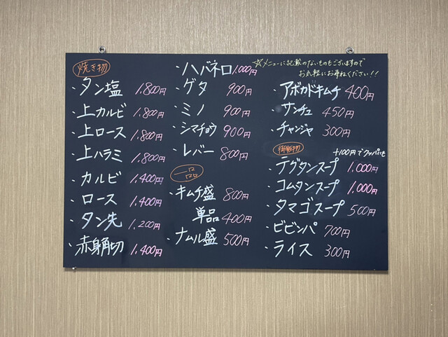 ★上タン塩、★ハラミ、★ロース、豚足、★赤身角切り、★センマイ刺し、アボカドキムチ、ミノ、ゲタカルビ、★レバー、梅干し、ユッケ、テグタンスープ