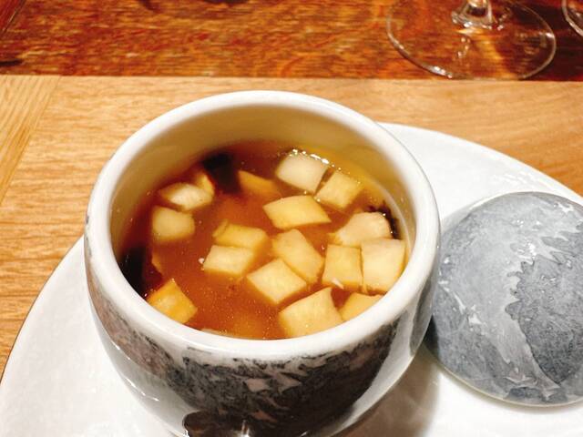 今は2軒しかやっていないという天然のじゅんさいがたっぷり。噛みごたえもある。川俣シャモのコンソメに帆立と雲丹も散りばめて味の変化も楽しい。サラダのように見た目も美しい1皿。