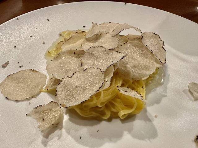 ★温かいパスタは卵黄と塩だけで練り込んだもので、細ーく切って湯がき、サマートリュフザクザク載せて。