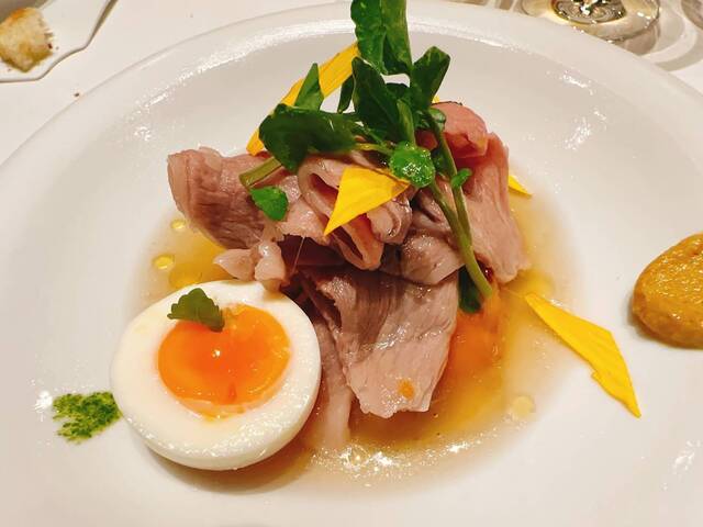 洋風すき焼き風に 鶏のブイヨンでジュレ、ズッキーニや野菜を焼いてマリネ 肉を載せてゆで卵も載せて